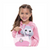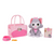 Incluye un tierno gatito gris con lazo rosado, su certificado de adopción, un comedero y una golosina con forma de pescado para que no le falte nada. El bolso rígido se abre como una casita, creando un espacio de juego mágico para tu nueva amiga.